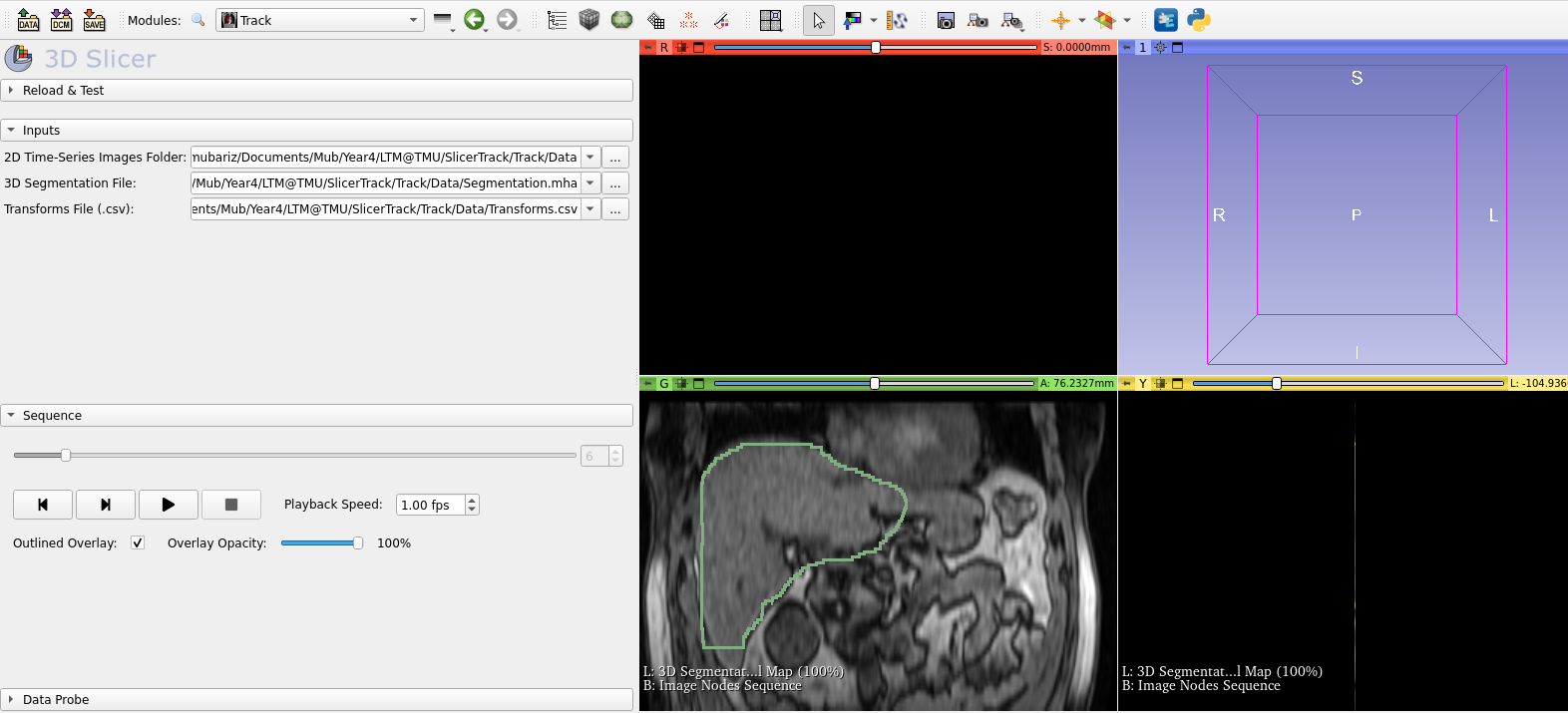 At the Laboratory for Translational Medicine I was tasked with developing SlicerTrack, a Python extension for the medical image analysis and manipulation software 3D Slicer. The extension's core function was to allow users to perform easy and dynamic tracking verification of an ROI, defined by a 3D segmentation, as it moves through a set of time-series MRI images.